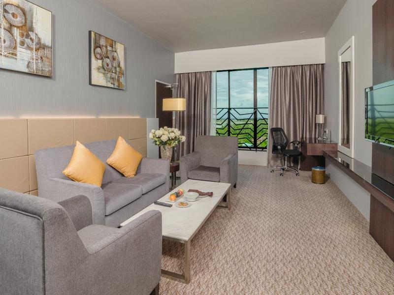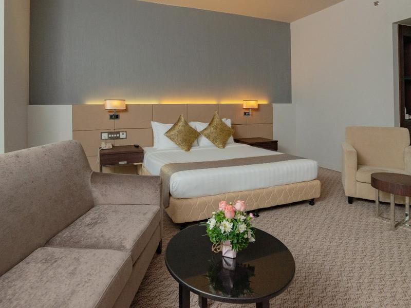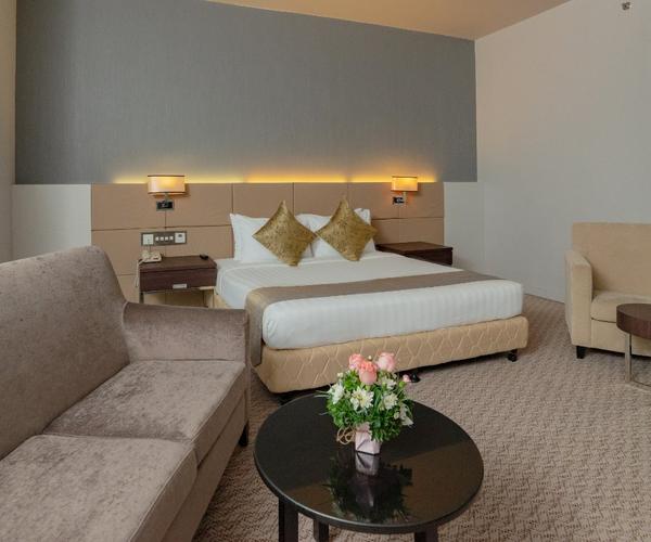 Modern room equipped with 1 King bed, sofa , air-conditioned , writing desk, telephone, flat-screen TV with satellite channels, electric kettle , ironing facilities and safe box. The en suite bathroom comes with shower , toiletries and a hairdryer.