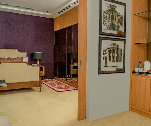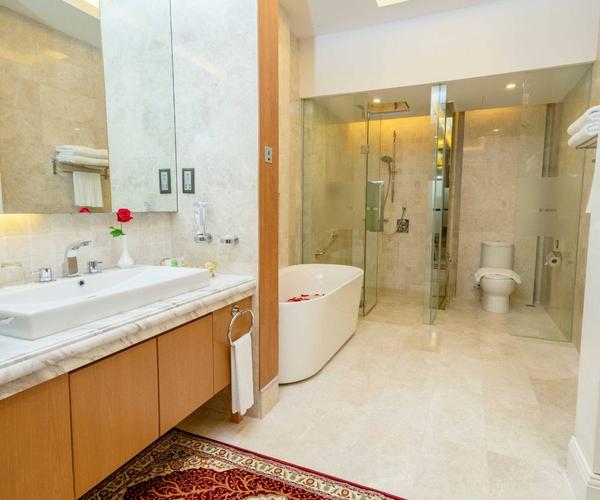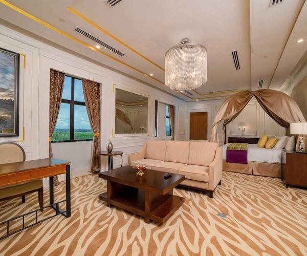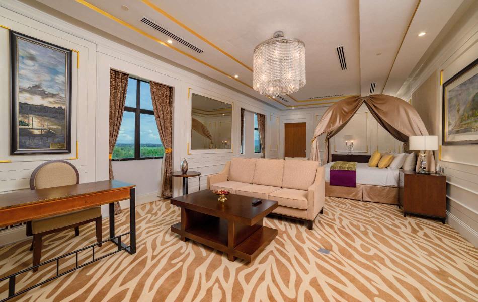 Savor the unparalleled privacy, spaciousness and luxury of our Royal Suite, which is located at level 8 at the tip of the hibiscus stigma. Within this 3,014 sq ft (280 sq mtr) duplex are 3 bedrooms with en suite bathroom, expansive living and dining area, two living hall, study room, walk-in wardrobe as well as kitchenette and bar area – all lavishly furnished to offer the ultimate experience for our guest. The room rate inclusive of premium amenities. Rooms are fitted with 2 King-size foster bed and 1 twin-size bed (separate unit) , air-conditioned with flat-screen TV and satellite channels, an electric kettle and a personal safe. The en suite bathroom comes with shower facilities, toiletries and a hairdryer. Pets are not allowed.