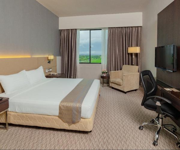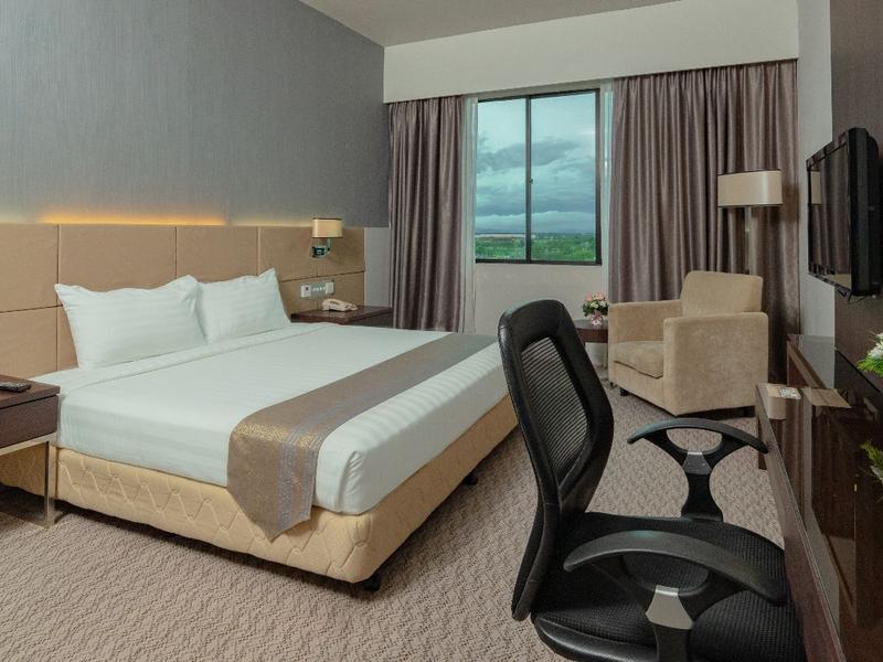 Modern rooms (35Sqm) with 1 King bed, air-conditioned , writing desk, telephone, flat-screen TV with satellite channels, electric kettle , ironing facilities and safe box. The en suite bathroom comes with shower , toiletries and a hairdryer.