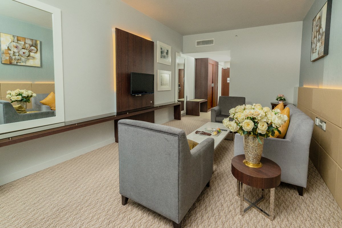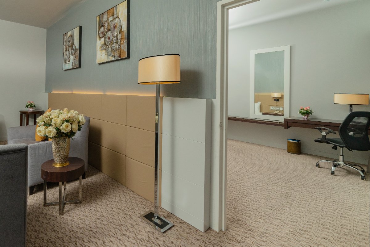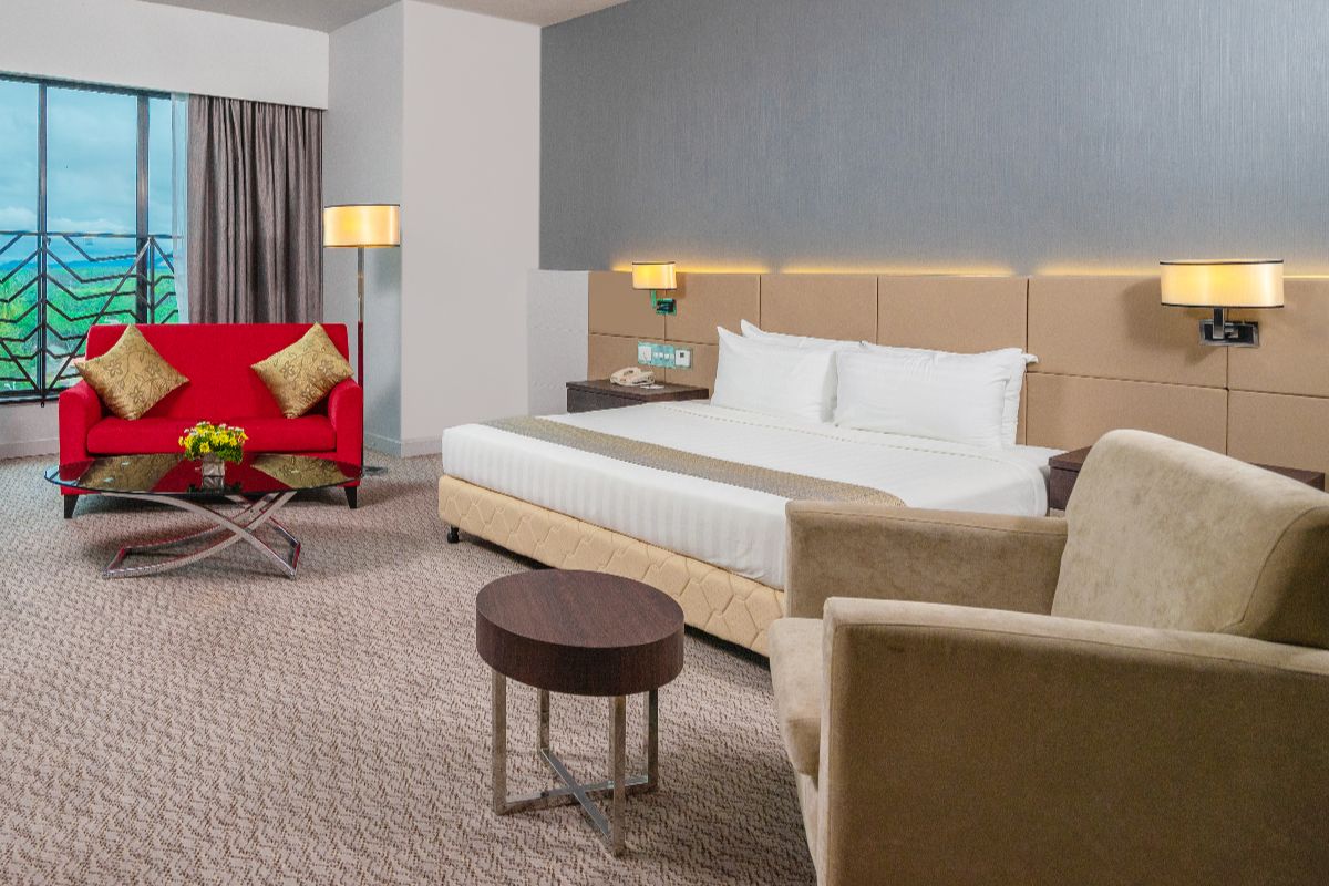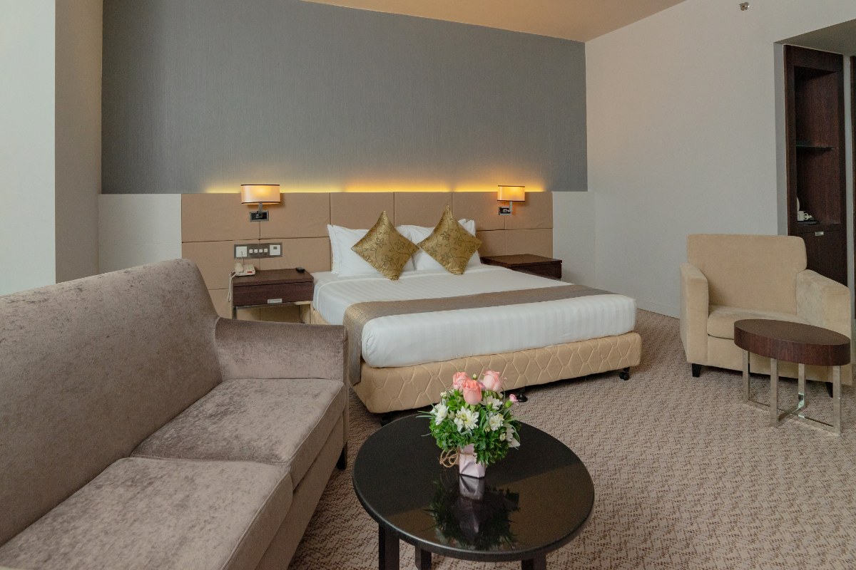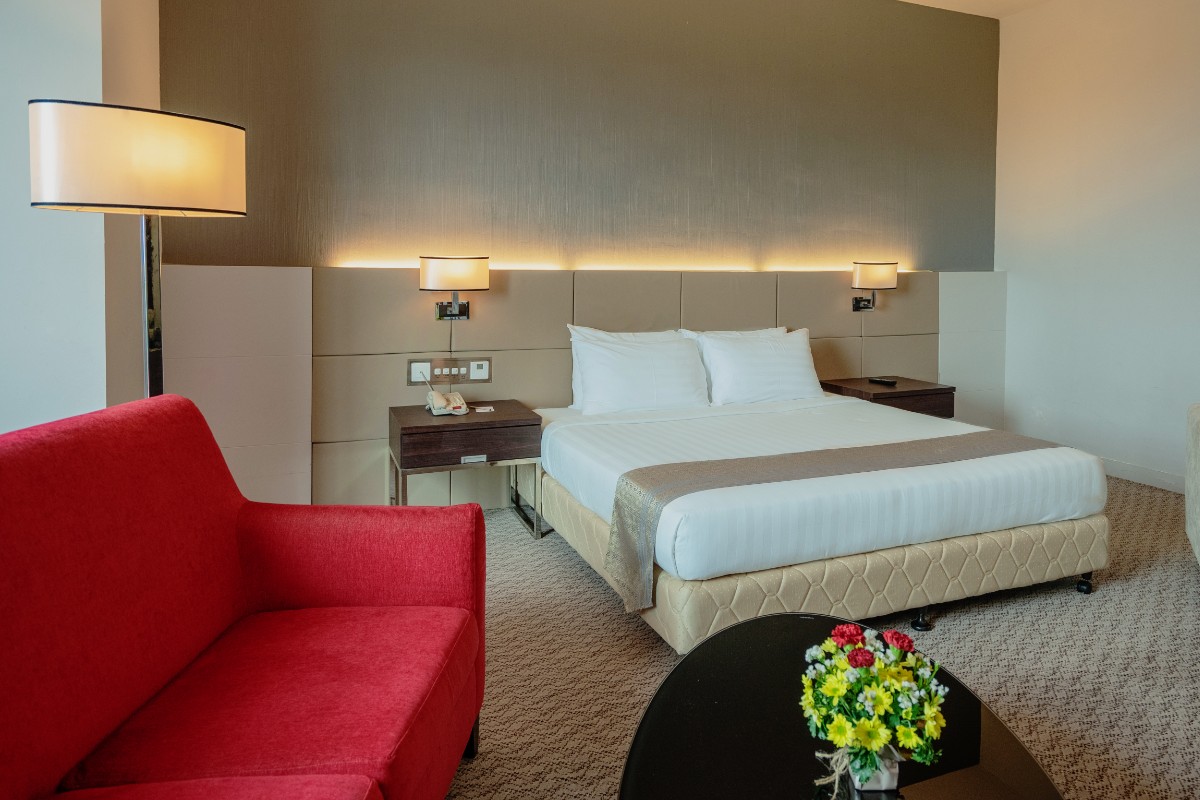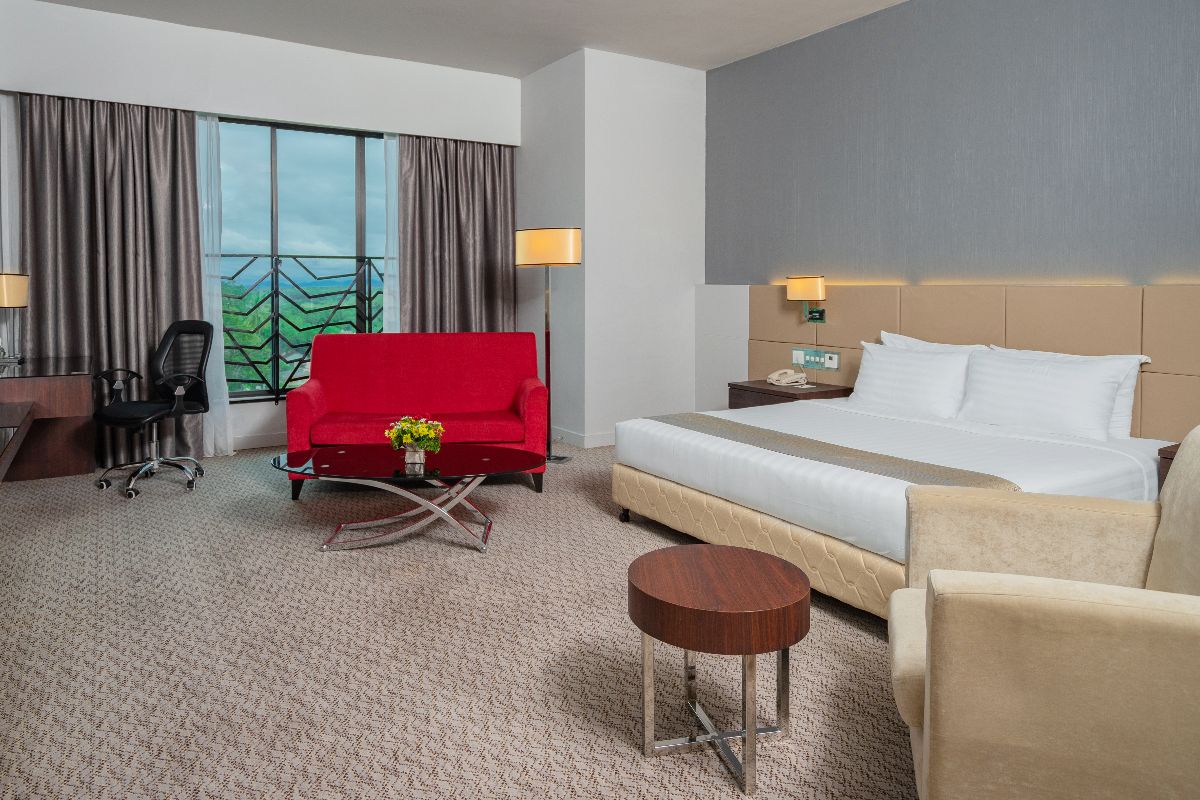 Modern room equipped with 1 King bed, sofa , air-conditioned , writing desk, telephone, flat-screen TV with satellite channels, electric kettle , ironing facilities …