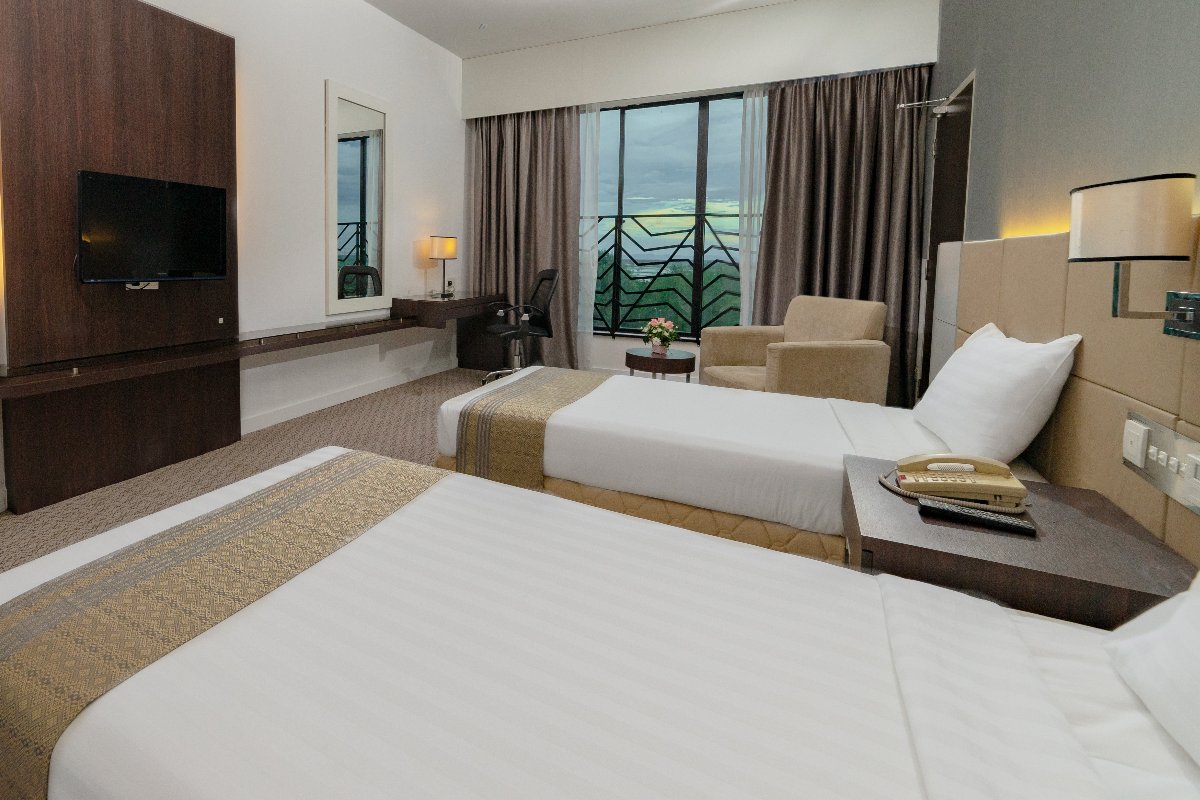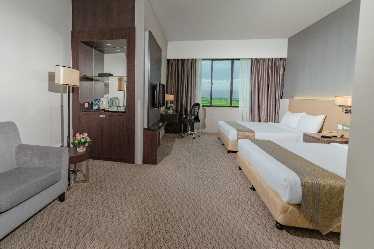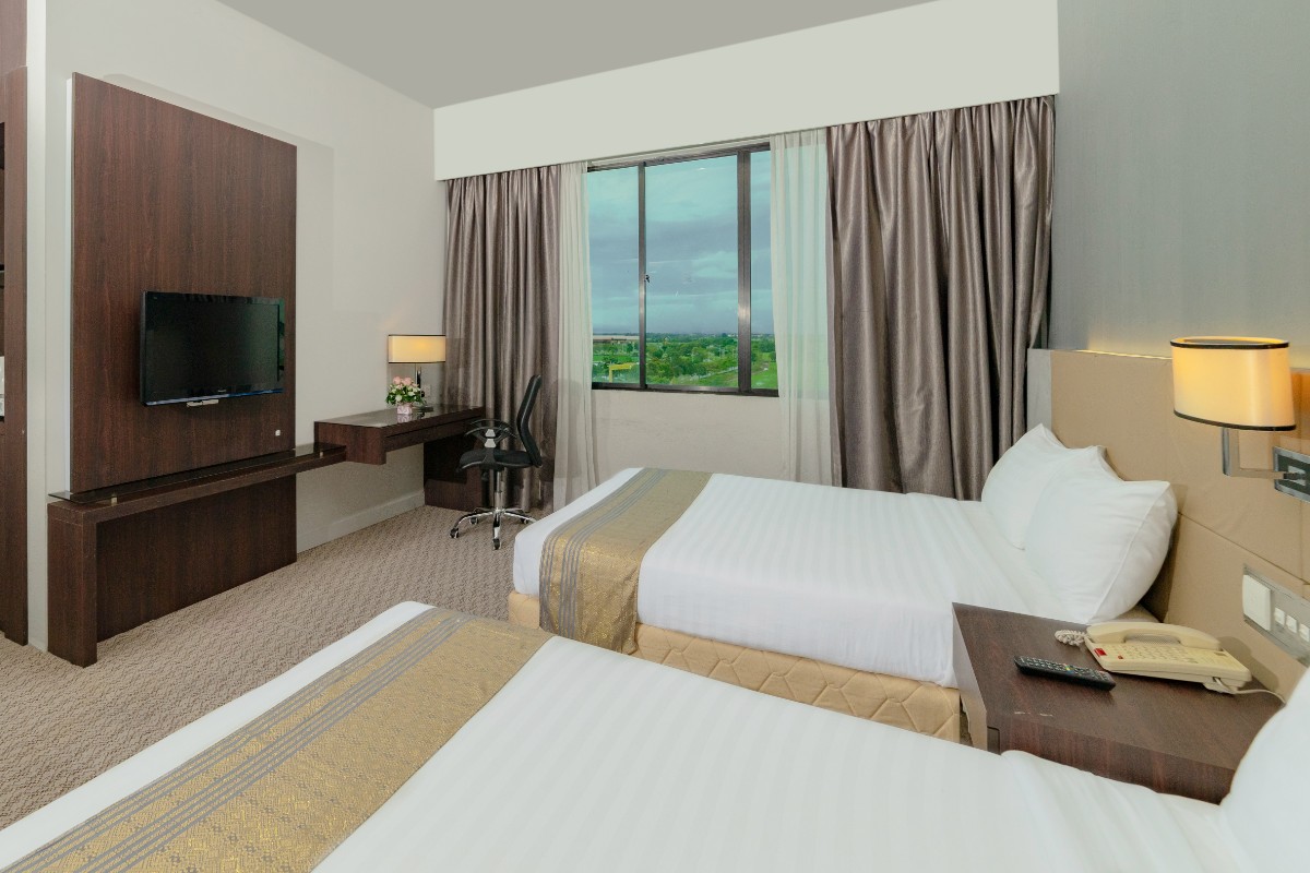 Modern rooms (35Sqm) with 2 Single bed, air-conditioned , writing desk, telephone, flat-screen TV with satellite channels, electric kettle , ironing facilities and safe box. The en suite bathroom comes with shower , toiletries and a hairdryer.