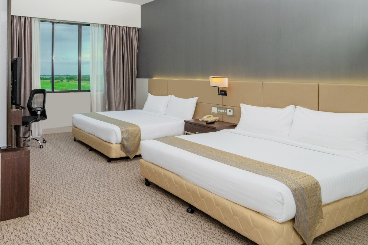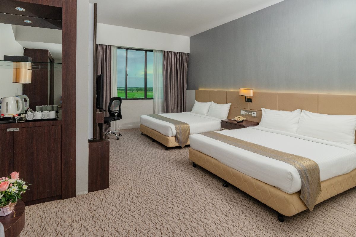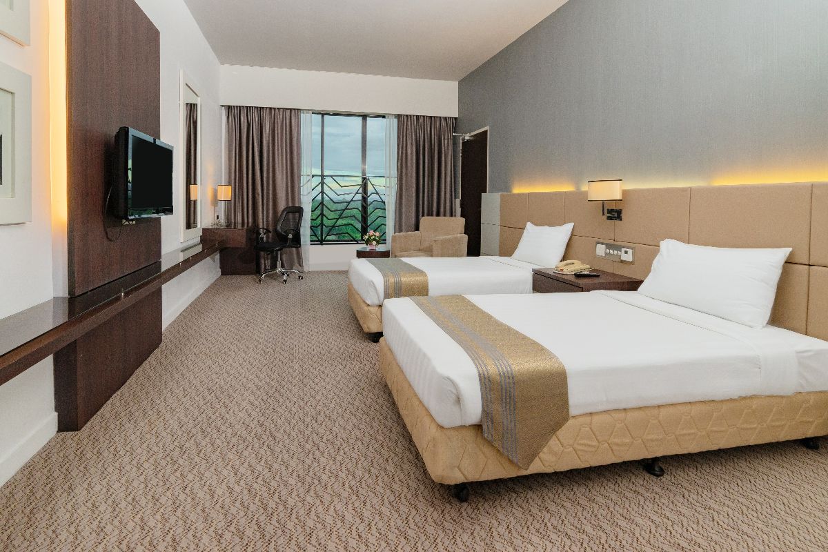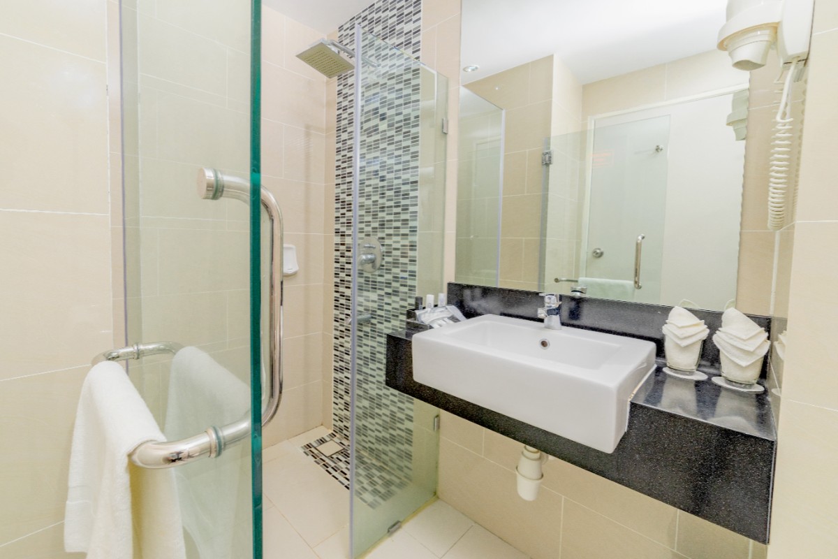 Modern rooms (35Sqm) with 2 Single bed, air-conditioned , writing desk, telephone, flat-screen TV with satellite channels, electric kettle , ironing facilities and safe box. The en suite bathroom comes with shower , toiletries and a hairdryer.
