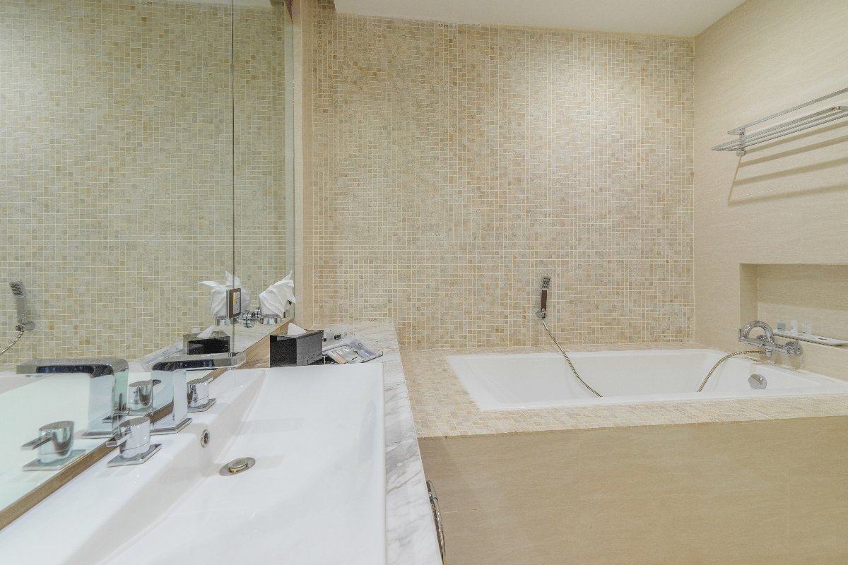 Modern room equipped with 1 King bed, air-conditioned , writing desk, telephone, flat-screen TV with satellite channels, electric kettle , ironing facilities and safe box. The en suite bathroom comes with bathtub, shower , toiletries and a hairdryer.