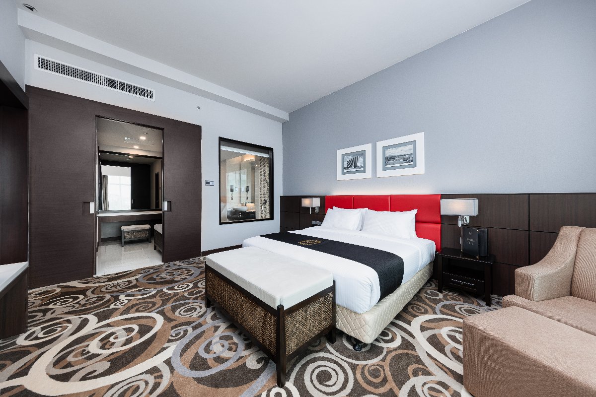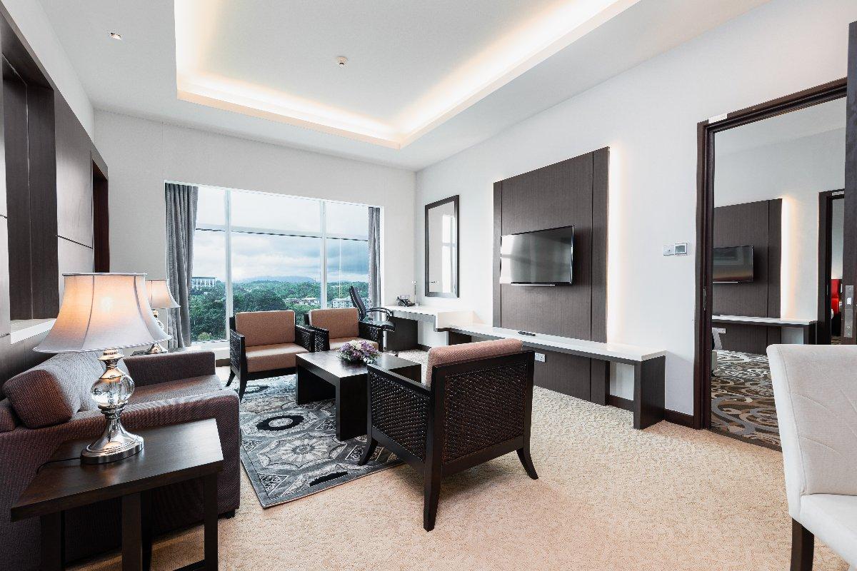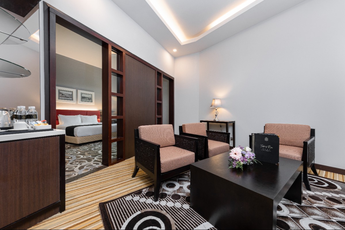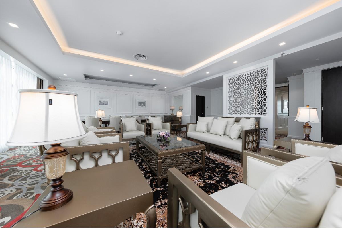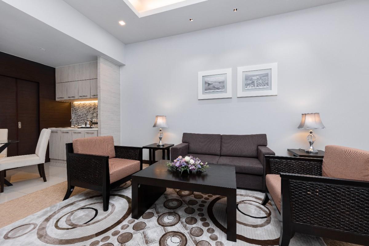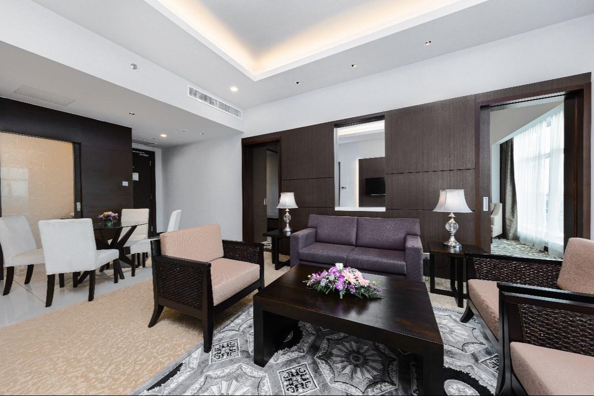 Rooms are fitted with a King-size bed and living area (58 sqm), equipped with air-conditioned, electronic keycard lock, flat-screen TV satellite channels, IDD telephone, work desk, tea/coffee making facilities, minibar, ironing facilities, and safe box. The en suite bathroom comes with shower facilities, toiletries, and a hairdryer. All units are non-smoking rooms.