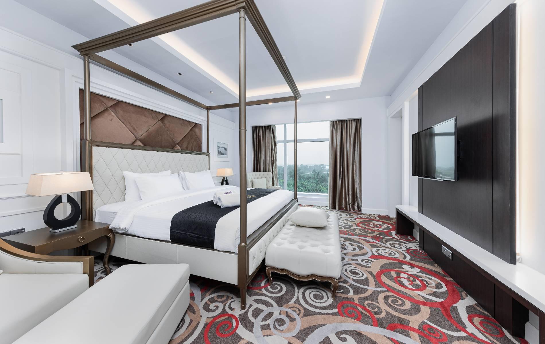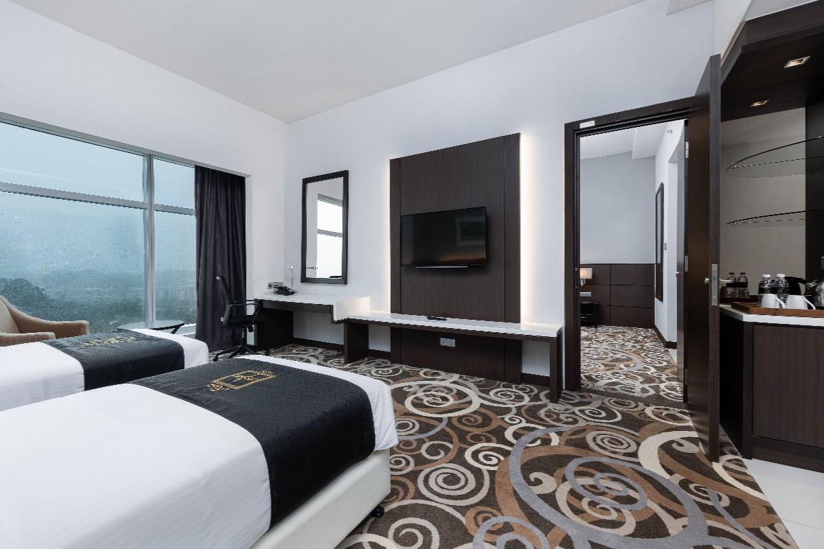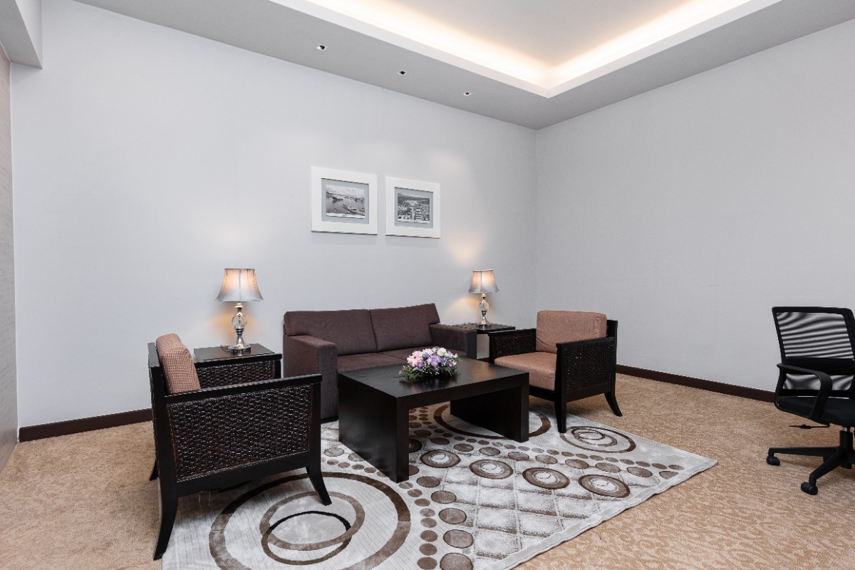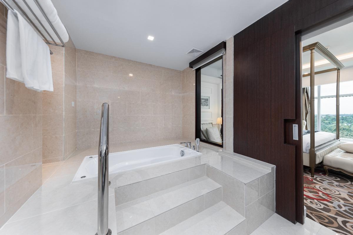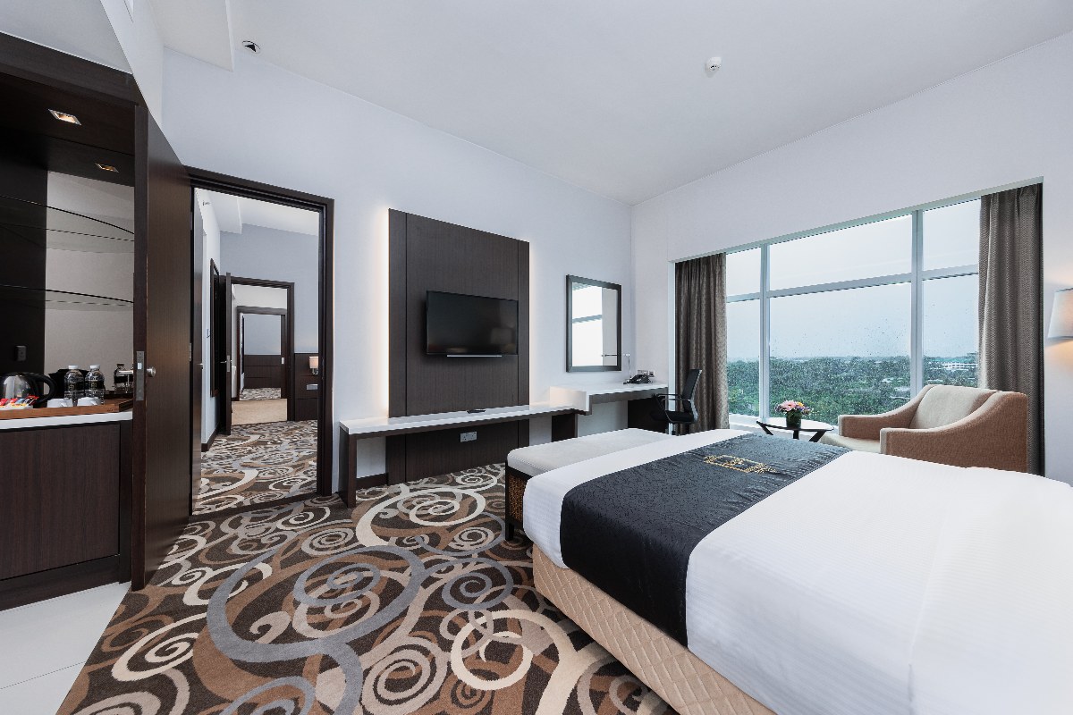 Rooms are fitted with a King-size bed and living area (58 sqm), equipped with air-conditioned, electronic keycard lock, flat-screen TV satellite channels, IDD telephone, work desk, tea/coffee making facilities, minibar, ironing facilities, and safe box. The en suite bathroom comes with shower facilities, toiletries, and a hairdryer. All units are non-smoking rooms.