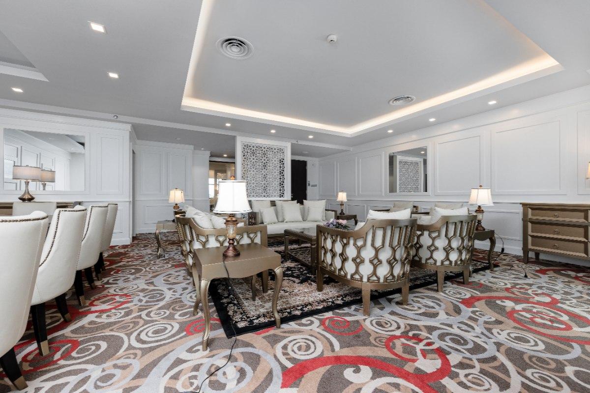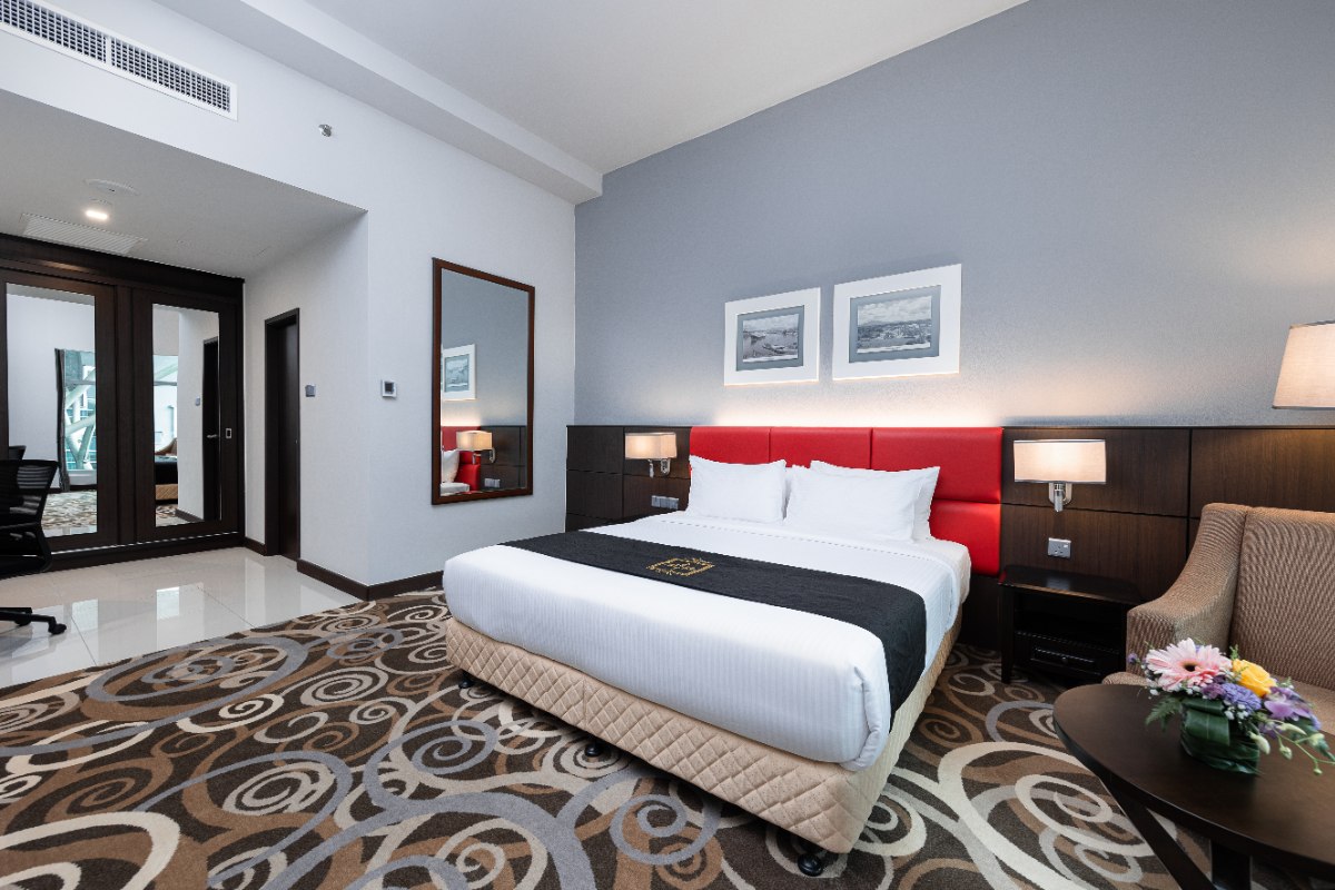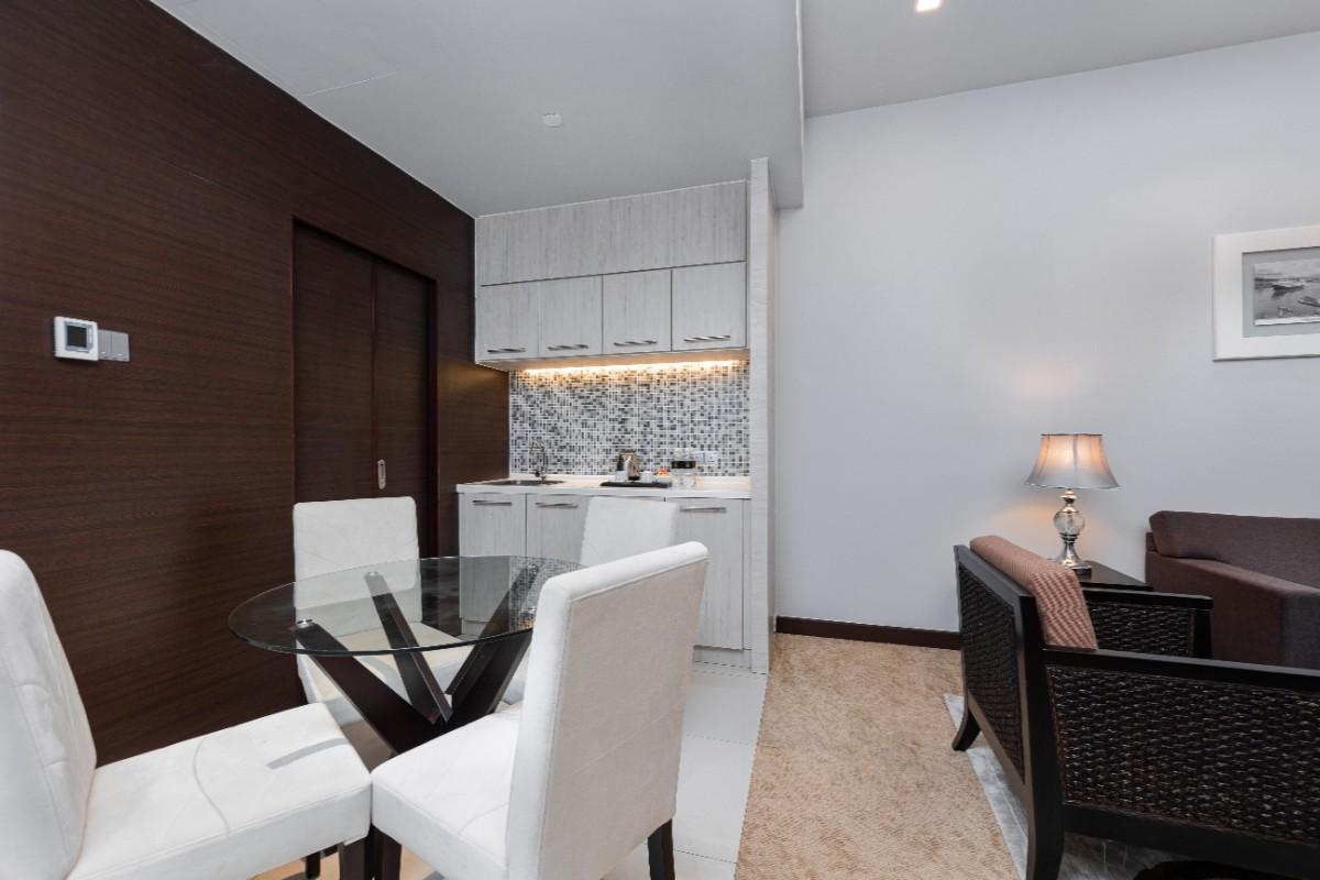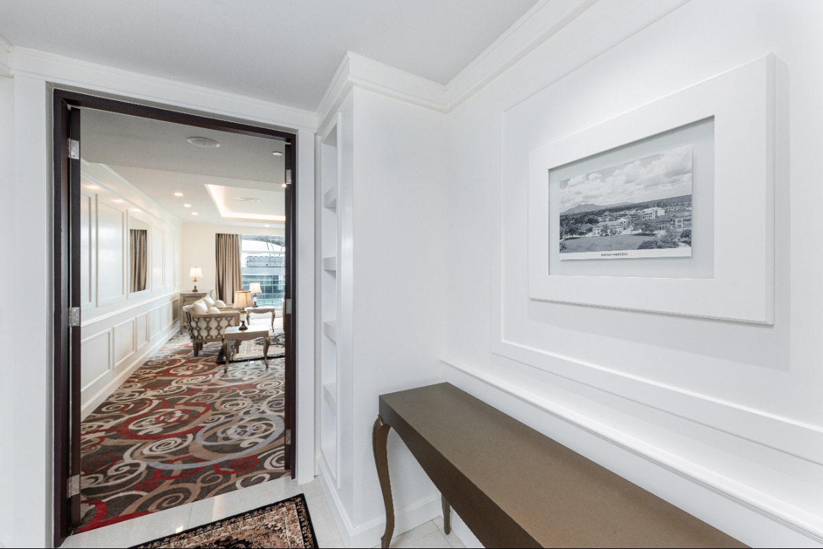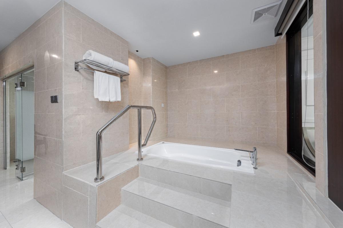 Rooms are fitted with a King-size bed and living area (58 sqm), equipped with air-conditioned, electronic keycard lock, flat-screen TV satellite channels, IDD telephone, work desk, tea/coffee making facilities, minibar, ironing facilities, and safe box. The en suite bathroom comes with shower facilities, toiletries, and a hairdryer. All units are non-smoking rooms.