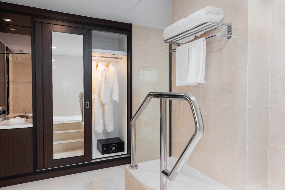 Rooms are fitted with a King-size bed and living area (72 sqm), equipped with air-conditioned, electronic keycard lock, flat-screen TV satellite channels, IDD telephone, work desk, tea/coffee making facilities, minibar, ironing facilities, and safe box. The en suite bathroom comes with shower facilities, toiletries, and a hairdryer. All units are non-smoking.