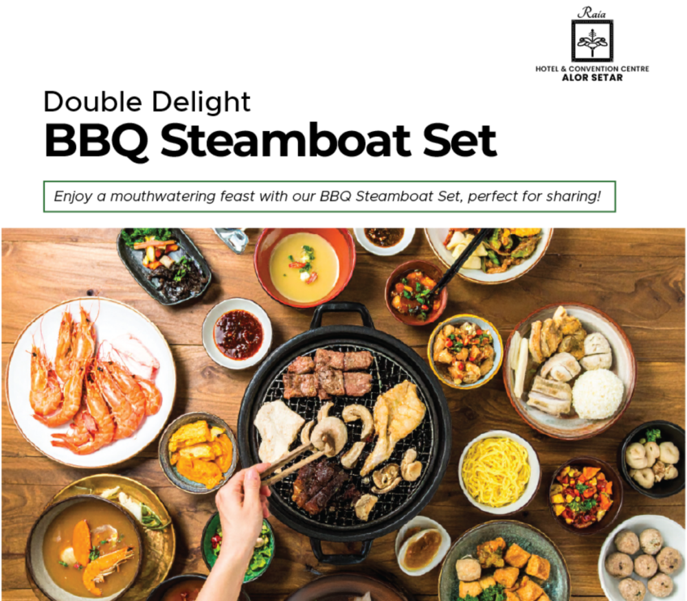 Experience our flavour-packed BBQ Steamboat Set at Raia Hotel & Convention Centre Alor Setar – the perfect dining choice for two. Enjoy a wide variety of fresh seafood, meats, vegetables, and handmade dumplings, all grilled and cooked to perfection at your table.