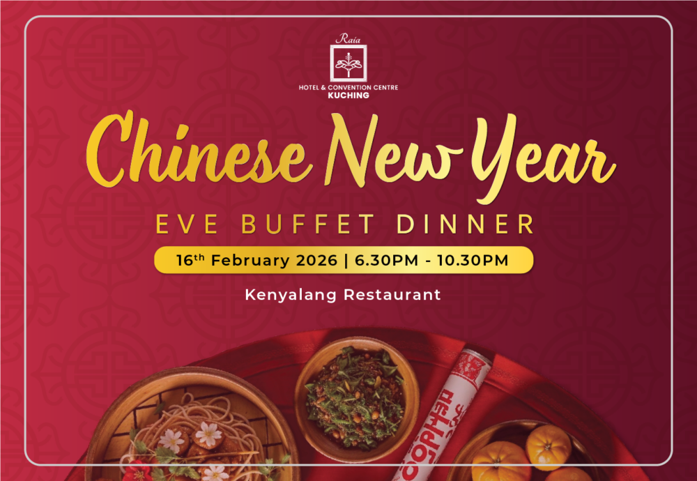 Welcome the Lunar New Year with a festive evening at Raia Hotel & Convention Centre Kuching. Join us for our Chinese New Year Eve Buffet Dinner at Kenyalang Restaurant, featuring a celebratory spread of traditional favourites perfect for welcoming prosperity, joy and togetherness with family and friends.