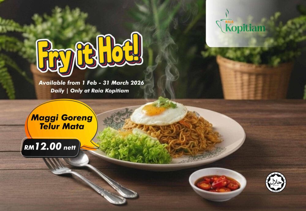 Craving something hot and satisfying? Visit Raia Kopitiam for our Fry It Hot! promotion, available daily from 1 February to 31 March 2026. Enjoy Maggi Goreng Telur Mata freshly prepared and served hot.