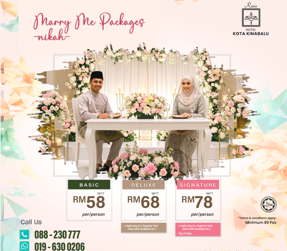 Celebrate your special day with Raia Hotel Kota Kinabalu’s beautifully curated Nikah Packages. Designed to create an intimate and memorable ceremony, our options include elegant décor, a thoughtfully arranged dais, and added conveniences for you and your family.