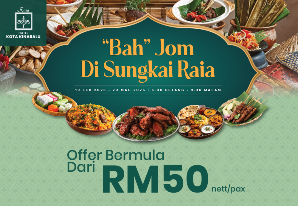 Rasai kemeriahan Ramadan di Raia Hotel Kota Kinabalu dengan buffet iftar “Bah, Jom di Sungkai Raia”, menampilkan pelbagai juadah tempatan dan pilihan antarabangsa yang sesuai dinikmati bersama keluarga dan rakan. Berlangsung dari 19 Februari hingga 20 Mac 2026 (6.00 pm – 9.30 pm), tetamu juga boleh menyertai Solat Tarawih berjemaah yang dipimpin khas sepanjang malam Ramadan.