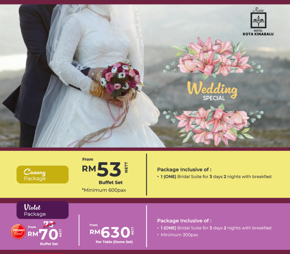 Raia invites you to envision your wedding through our spaces, and to create your once in a lifetime memories filled with romance and warmth. Reach out to us to find out more. Cipta memori indah untuk majlis perkahwinan anda di Raia Hotel Kota Kinabalu. Raikan cinta dengan pelbagai tawaran pakej perkahwinan.